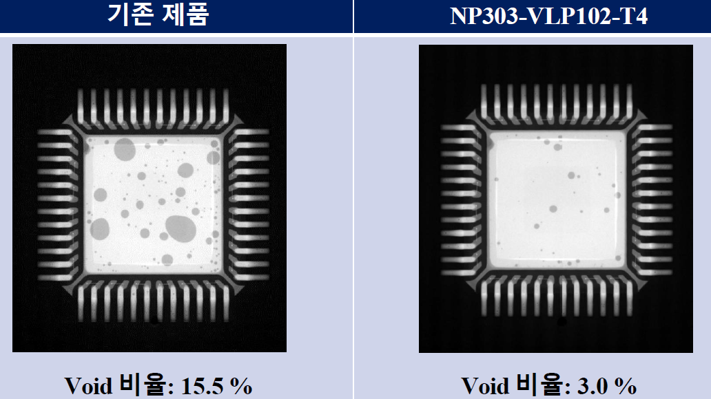 VLP102는 BGA 실장 공정에서도 적용 가능하며, 고신뢰성 제품 및 자동차 전장용 SMT 생산 라인에서의 보이드 억제 요구에 대응할 수 있는 제품입니다.